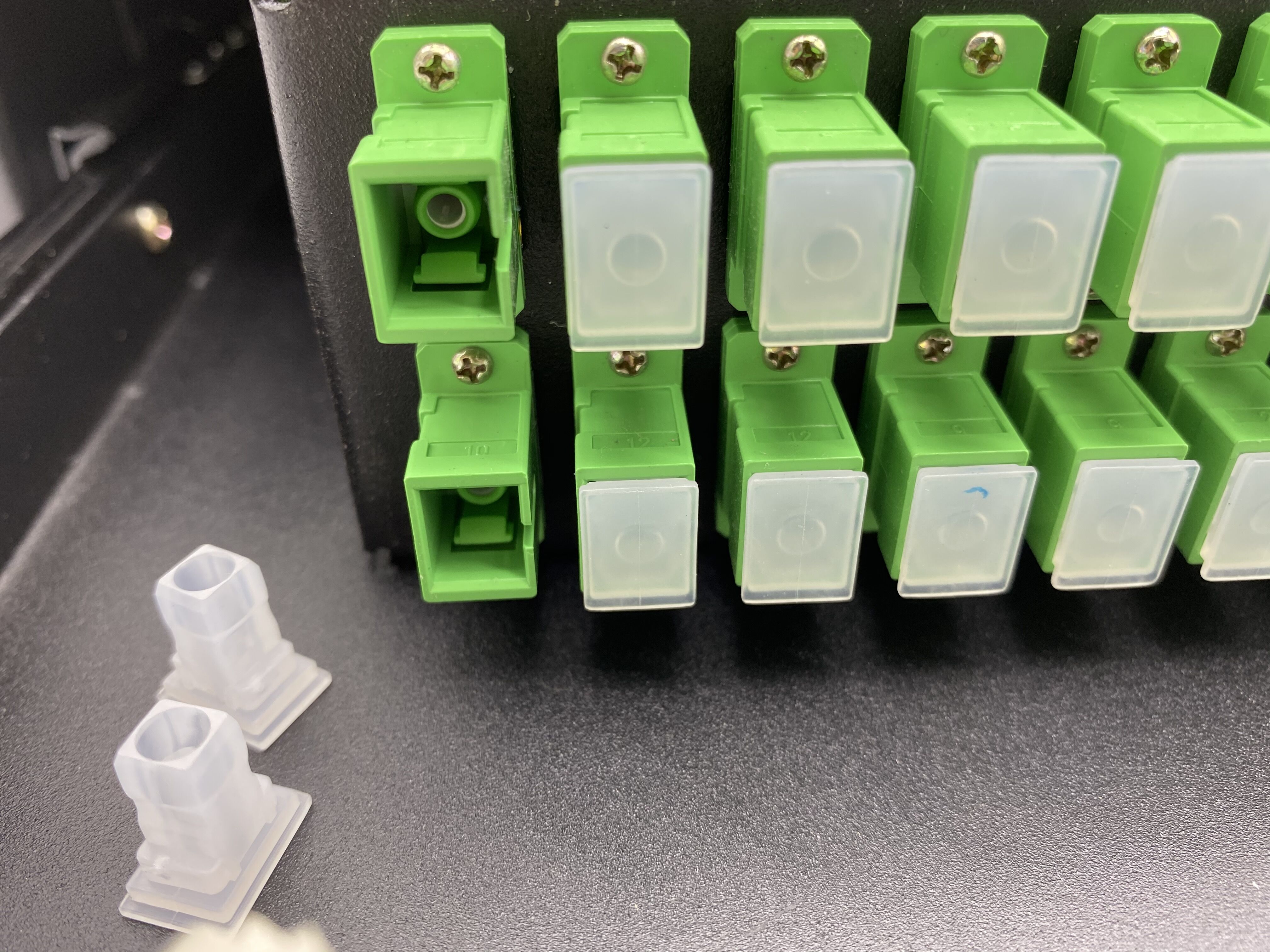 We suggest to use transparent dust cap for adapters so as to test if the fiber is broken or not by human eyes easily. Also it is beautiful, but other dust cap is available on request. Also this box can use E2000 SC LC ST FC adapters.